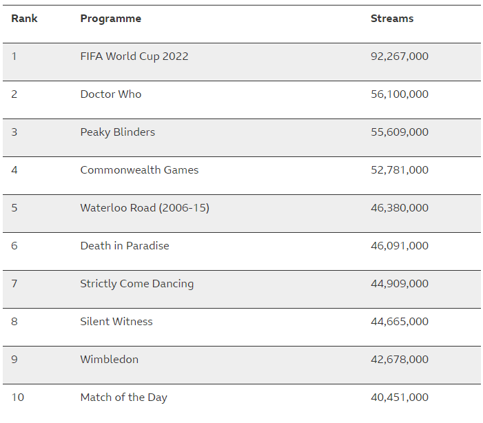 - Sporting events were also among the most-watched programmes of the year, including Commonwealth Games (53m streams, plus reached 28.6 million on BBC TV) and Wimbledon (43m streams, plus reached 27.4 million on BBC TV)