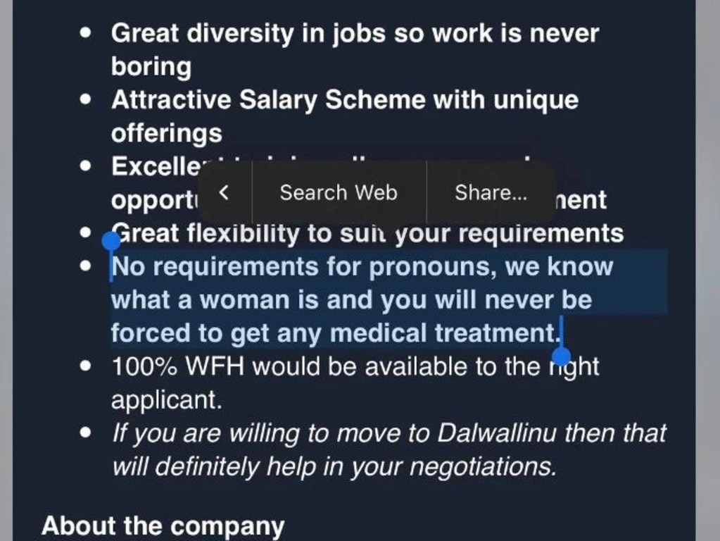 Under the “core position details” part of the job description, potential applicants were informed there would be “no requirements for pronouns”.