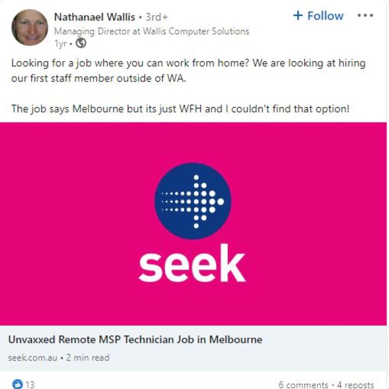 Last year, managing director Nathanael Wallis shared a job vacancy to LinkedIn which was titled: “Unvaxxed Remote MSP Technician job”.