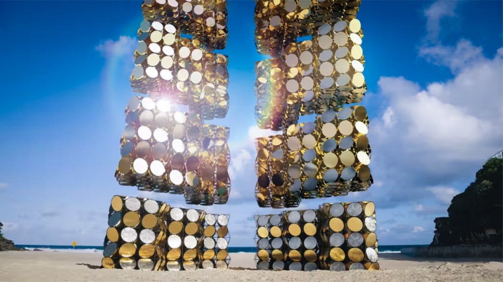 Mond Qu’s large-scale sculpture, installed in the sand at Tamarama beach, features over 1,000 glimmering circular light reflectors in a geometric design which scatters sunlight in diverse directions to create a dazzling display that changes as the sun rises and falls.