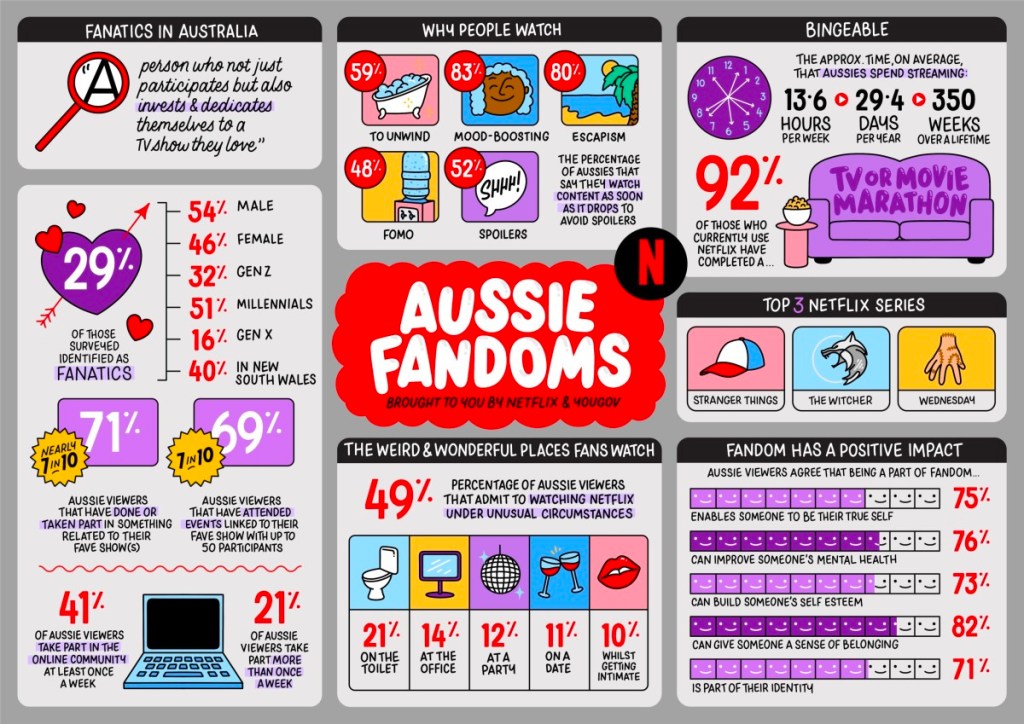 Australians are deeply involved in fandoms, 29% of those surveyed were identified as “fanatics”, while 73% have done or taken part in something related to their favourite show. Stranger Things, The Witcher, and Wednesday emerged as the top three Netflix series among Australian fans.