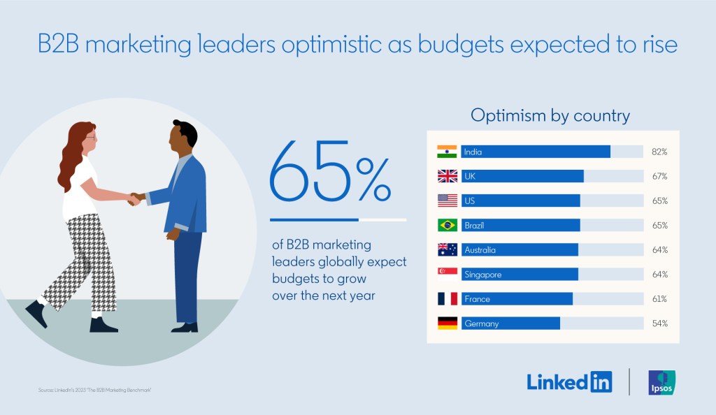 *Methodology: LinkedIn commissioned Ipsos to survey 1,954 B2B CMOs, CFOs and senior-level B2B marketers at small, medium and large organizations across the globe (US, UK, Germany, France, India, Australia, Singapore and Brazil) to examine how they’re faring amid uncertainty, what they’re doing to drive growth at their companies and how their roles are evolving. The research was conducted online between March 24 and May 5 2023.