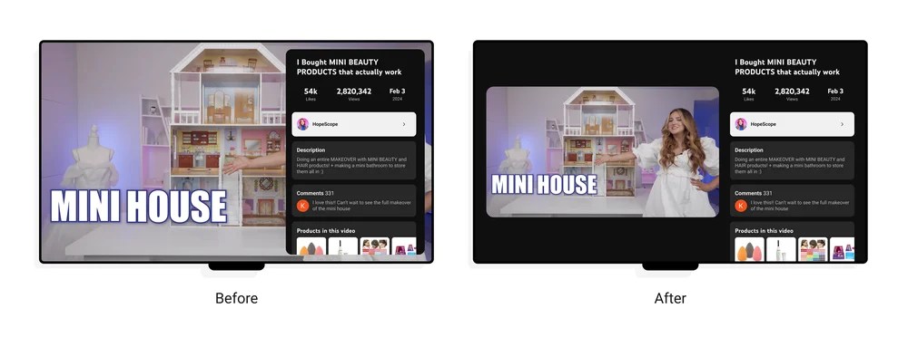 We began tinkering with the idea of reducing the size of the video player and simplifying the interactions, so signature features such as comments can live alongside the content rather than obscuring it. This became the foundation for how we could bring the best of YouTube directly to the living room. Rolling out over the next few weeks, our new design will not only improve existing functionality like accessing video descriptions and comments, but also open the door for a broad range of new experiences such as shopping for your creators’ favorite products and viewing live scores for sports fans.