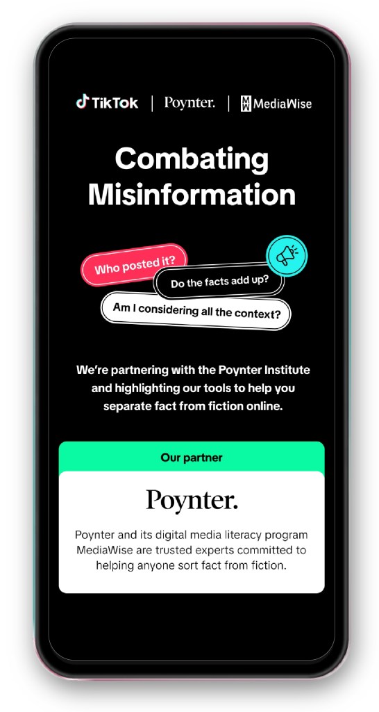 While experts widely recommend AIGC labeling as a way to support responsible content creation, labels can often cause confusion. TikTok will be working with experts to develop media literacy campaigns that can help our community identify and think critically about AIGC and misinformation. As example, MediaWise is programme that highlights universal media literacy skills while explaining how TikTok tools like AIGC labels can further contextualize content.
