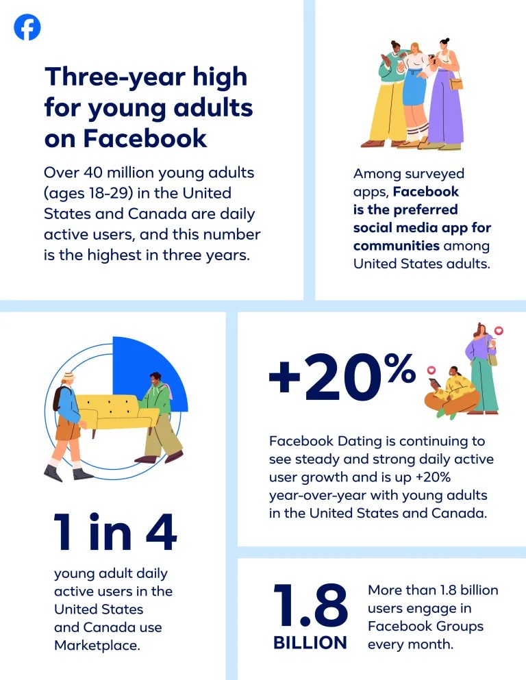 Young Adults are making big transitions – moving, going to college, getting their first job or apartment. And Facebook can help with all of this, whether it’s finding great deals on furniture on Marketplace, exploring their interests with Reels and in Groups, connecting with their local communities and small businesses, or finding someone they like on Facebook Dating.