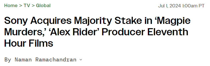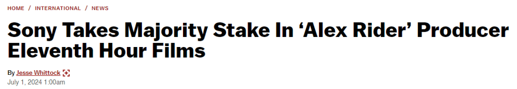 [July 1, 2024 – London] Sony Pictures Television (“SPT”) has today announced that it has increased the investment it made in 2018 to take a majority stake in Eleventh Hour Films (“EHF”). The investment will see EHF become the fourth majority-owned, UK-based scripted drama company in the SPT International Production group, alongside Left Bank Pictures, Bad Wolf and Eleven.