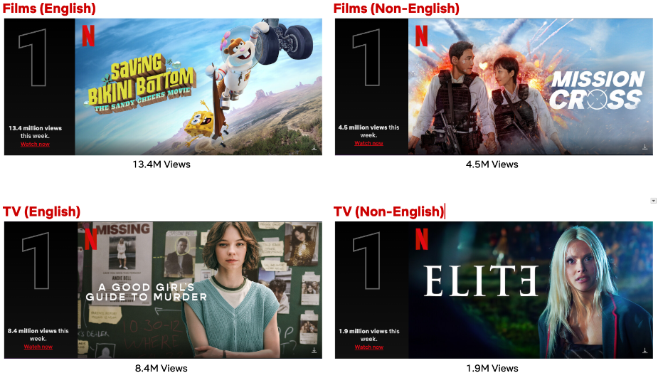 Super sleuths ruled the Top 10 Lists this week. Saving Bikini Bottom: The Sandy Cheeks Movie cracked the case of the missing undersea town and #1 on the English Films List, with the film, produced by Nickelodeon Animation, racking up 13.4M views. The adaptation of Holly Jackson’s best-selling series, A Good Girl’s Guide to Murder, starring Wednesday’s Emma Myers, solved the mysterious death of Andie Bell and took #1 on the English TV List with 8.4M views. Meanwhile, the students of the eighth and final season of Elite (Spain) uncovered the identity of the secret society, Alumni, and landed at #1 on the Non-English TV List with 1.9M views.