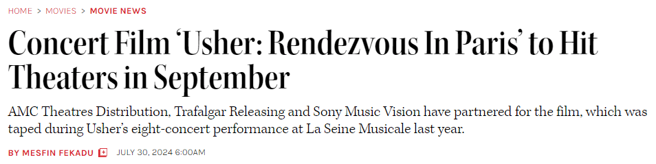 “For 30 years USHER has captivated and entertained audiences through his music and concerts. Just a few months ago, he drew rave reviews for his stunning performance in front of 129 million people during the Super Bowl Half Time Show. Bringing his unparalleled concert experience to movie theatres for his fans around the world is a perfect fit for AMC Theatres Distribution,” said Adam Aron, Chairman and CEO, AMC Theatres.