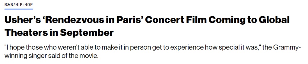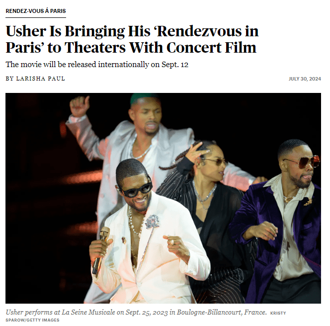 USHER: RENDEZVOUS IN PARIS will screen in 2,000 cinemas worldwide, including approximately 1,000 cinemas in the United States. The film will play at AMC and ODEON locations, and many other locations globally. Worldwide screening details and ticketing will be available at UsherinParis.com on August 6 at 9:00 a.m. ET / 6:00 a.m. PT. Fans are encouraged to sign up for further information. Screenings will take place between September 12 – 15 and may vary by location.