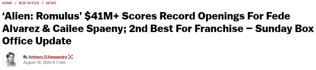 This is the second biggest domestic opening in the current Alien series and the biggest opening of director Fede Alvarez’s career.