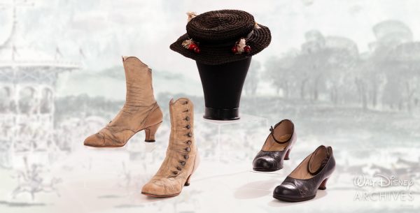Pictured above are several items from Mary’s wardrobe that Walton and his team designed: Mary’s classic black hat, with bright red cherries and flowers; her “Jolly Holiday” boots; and her arrival shoes. Becky Cline, Director of the Walt Disney Archives, recalls a time in her career when she received frequent phone calls from Disney enthusiasts who inquired how many cherries were on Mary’s hat. (If you’re wondering, the answer is eight.)