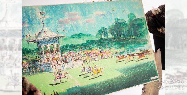 The production art above, which depicts the iconic horse race sequence, is a perfect example of the talent, skill, and imagination of art director Carroll Clark and artists (and Disney Legends) Xavier “X” Atencio, Don DaGradi, Bill Justice, and Peter Ellenshaw. This colorful artwork is among hundreds of concept drawings, exploratory sketches, matte paintings, and other visual art from the production carefully preserved in the Walt Disney Archives.