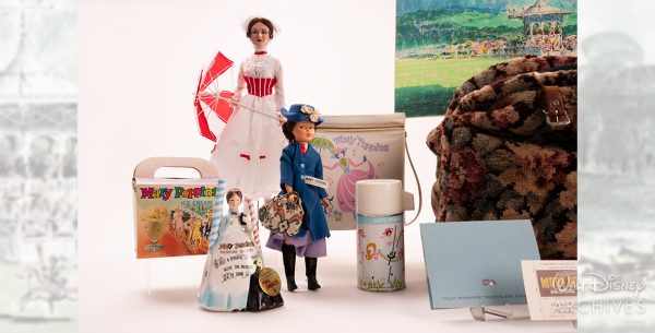 Pictured above are several notable pieces from the Archives’ collection of merchandise. Two Mary Poppins dolls—one more vintage, in a stylish blue jacket with matching hat, and a more recent one sporting her iconic “Jolly Holiday” look—showcase the differences and looks across generations.