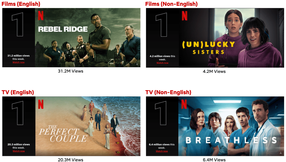 Heartfelt drama (Un)lucky Sisters (Argentina) moved up the Non-English Films List to claim the top spot with 4.2M views. Returning for another week were shark thriller Under Paris (France) in eighth, drama Untamed Royals (Mexico) in ninth and comedy adventure Mission: Cross (Korea) in tenth place.