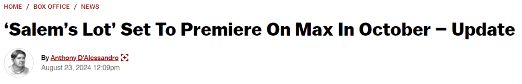 - New Line Cinema’s film adaptation of Stephen King’s 1975 bestselling novel “Salem’s Lot” debuts THURSDAY, OCTOBER 3 on Max. The Max Original film SALEM’S LOT reunites the producing teams behind the record-breaking horror franchises “The Conjuring” universe and the “It” films. Gary Dauberman writes, directs, and executive produces the film. Producers are James Wan and Michael Clear for Atomic Monster; Roy Lee for Vertigo; and Mark Wolper.