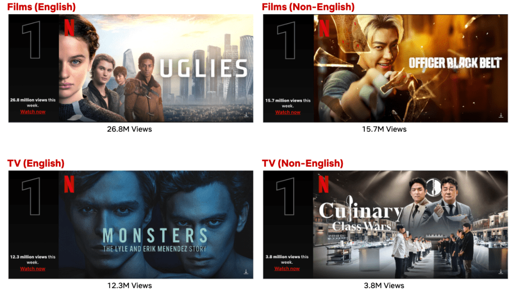 Ryan Murphy and Ian Brennan’s true-crime drama Monsters: The Lyle and Erik Menendez Story debuted at #1 on the English TV List with 12.3M views and ranked in the Top 10 in 89 countries. The second installment of the captivating Monster anthology series stars breakouts Nicholas Alexander Chavez and Cooper Koch (who gave a brilliant and powerful episode 5 performance ), alongside Javier Bardem, Chloë Sevigny, Nathan Lane, and Ari Graynor.