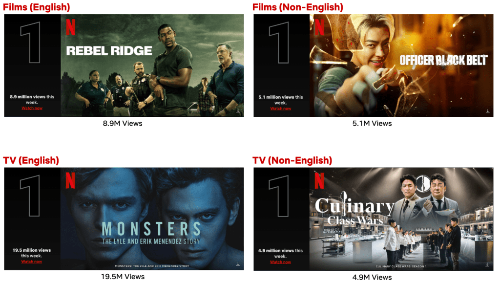 Ryan Murphy and Ian Brennan’s true-crime drama Monsters: The Lyle and Erik Menendez Story held strong at #1 on the English TV List with 19.5M views, ranked in the Top 10 in 89 countries and was the most watched title of the week. The second installment of the Monster anthology series starring breakouts Nicholas Alexander Chavez and Cooper Koch alongside Javier Bardem, Chloë Sevigny, Nathan Lane and Ari Graynor, tracks the sensational case through the differing perspectives of the prosecution, the defense and the public.