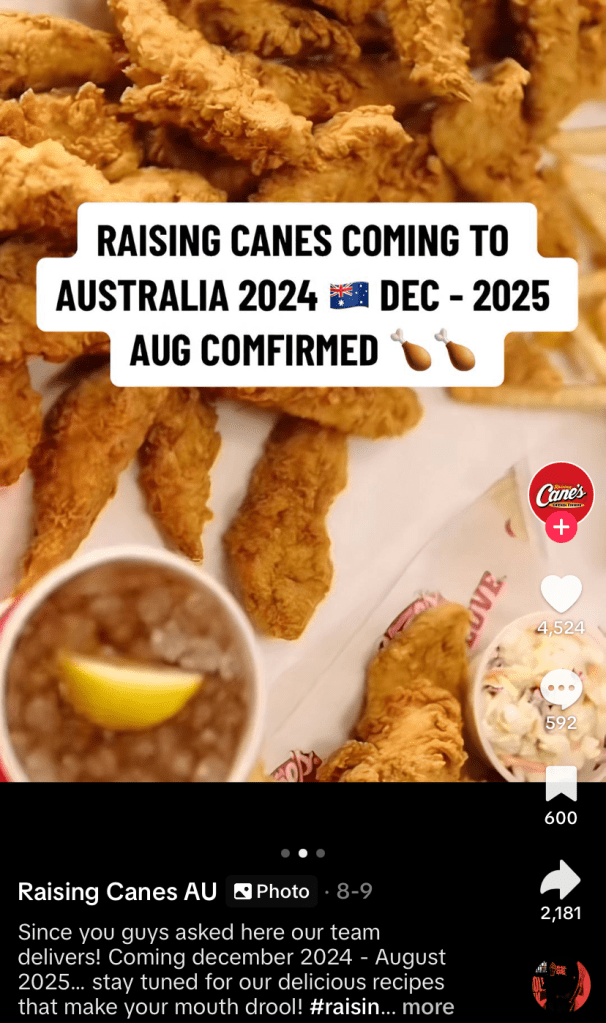 Earlier this year, accounts and posts spread through TikTok falsely claimed that the US-based fried chicken brand Raising Cane’s was coming down under, some being viewed and shared thousands of times.