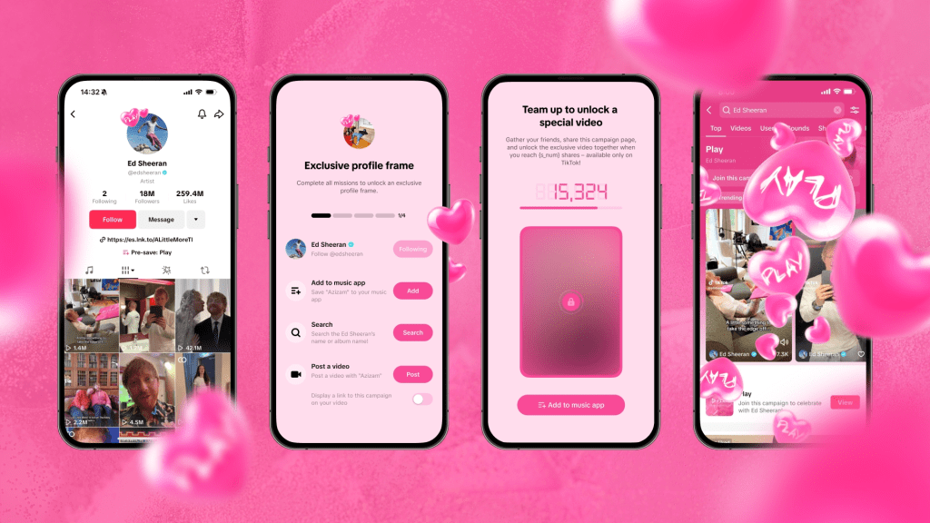 - Play Profile frame: Fans can complete a series of simple in-app tasks, such as following @edsheeran, saving his music to a music streaming service, or posting a video using #EdSheeran to unlock an exclusive ‘Play’ profile frame