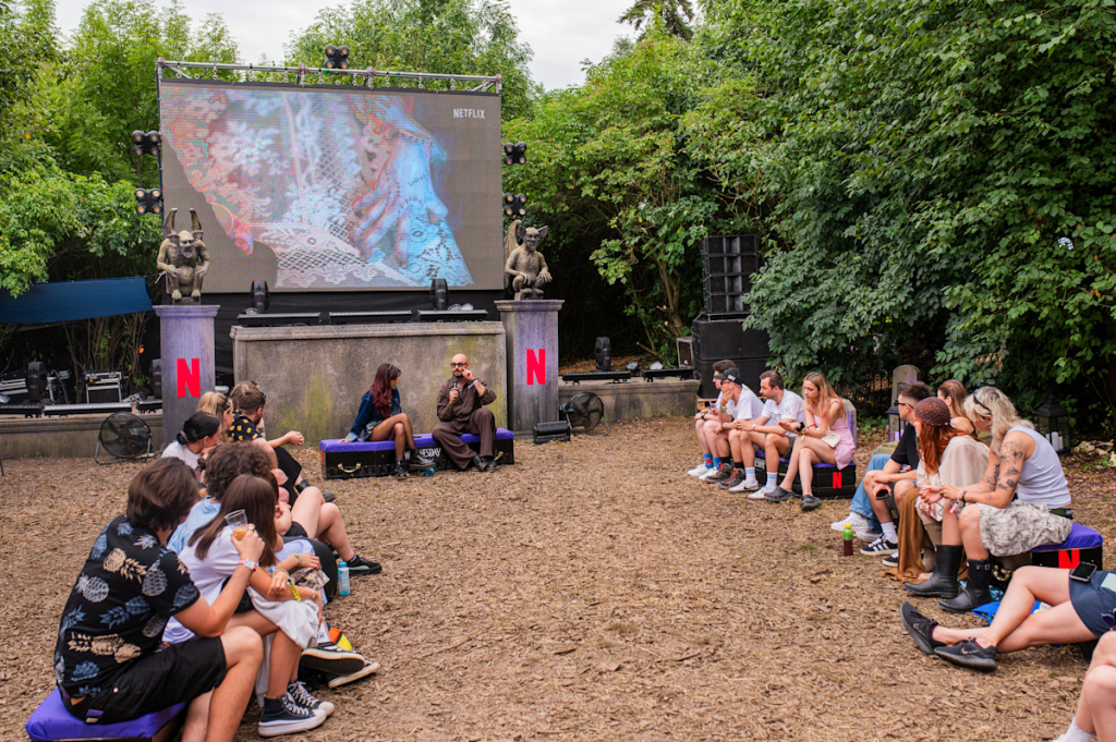 We created a special Outcast-only zone at the Electric Castle music festival. Festivalgoers stepped through the Nevermore gates into the world of the show, where they could take photos in Enid and Wednesday’s dorm room and Pugsley & Fester’s Electric Corner, lounge in coffins in the graveyard and begrudgingly take part in activities like palm readers, dead flower crown creation, a voodoo doll workshop, tattoo artists and live performances by Cojo and Muse Quartet.