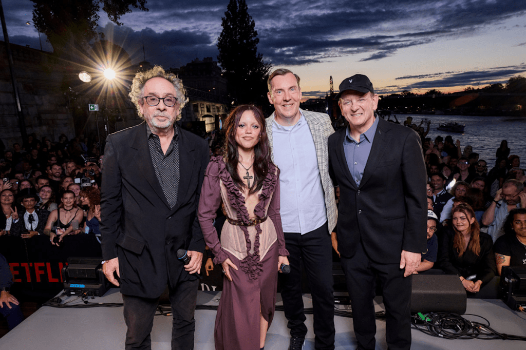 The macabre madness spread across the US with screenings in 10 cities. At Chicago’s Music Box Theater, Georgie Farmer and Isaac Ordonez greeted fans before a screening of the Season 2 premiere. At Atlanta’s Plaza Theater, Myers and Sunday made a surprise appearance. And at our own Paris Theater in New York, stars Jenna Ortega, Farmer, Emma Myers and Joy Sunday, along with Fred Armisen, Catherine Zeta-Jones, Luis Guzmán, posed for pictures before a special screening of the Season 2 premiere.