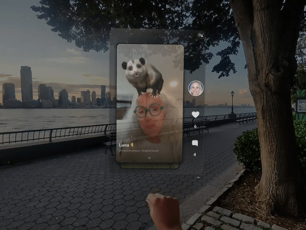 Now you can do the dishes while your favorite creator’s video plays seamlessly in front of your eyes, or layout comments in 3D space. The portrait orientation of our Spectacles’ field of view is a perfect fit for vertical video, allowing you to enjoy content without ever having to look down at your phone. Easily anchor Spotlight in one place, or have it follow you as you move around.